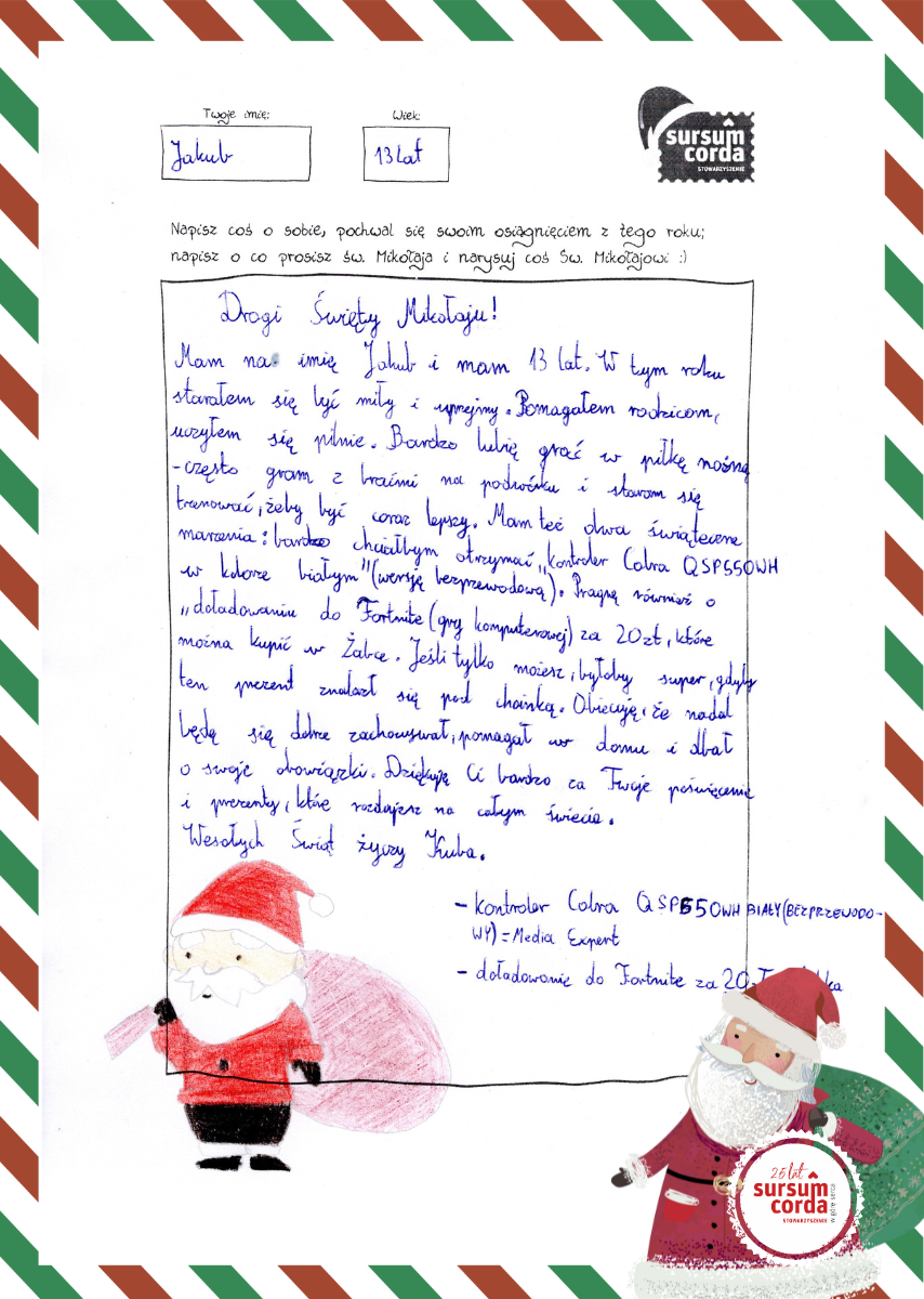 Dziękujemy! Wybrałeś opcję wpłaty darowizny. Przechodząc dalej, skorzystaj z bramki płatnościowej PRZELEWY24. Mikołaj zakupi za przekazaną kwotę wybrany przez Ciebie prezent lub prezenty.