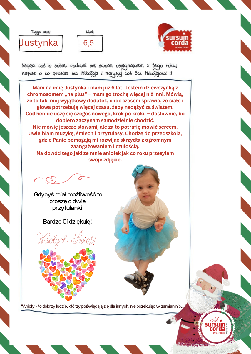 Justynka to sześcioletnia dziewczynka z zespołem Downa, która choruje na padaczkę z napadami polimorficznymi. Obecnie ataki praktycznie się wyciszyły, niemniej jednak jej rozwój jest mocno opóźniony. Justysia nie mówi i słabo wyraża swoje potrzeby. Dodatkowo Justynka jest osobą słabowidzącą, która spotyka się z wieloma trudnościami każdego dnia. Największe to chyba problemy z komunikacją oraz chodzeniem, dlatego tak ważna jest codzienna rehabilitacja i ćwiczenia.