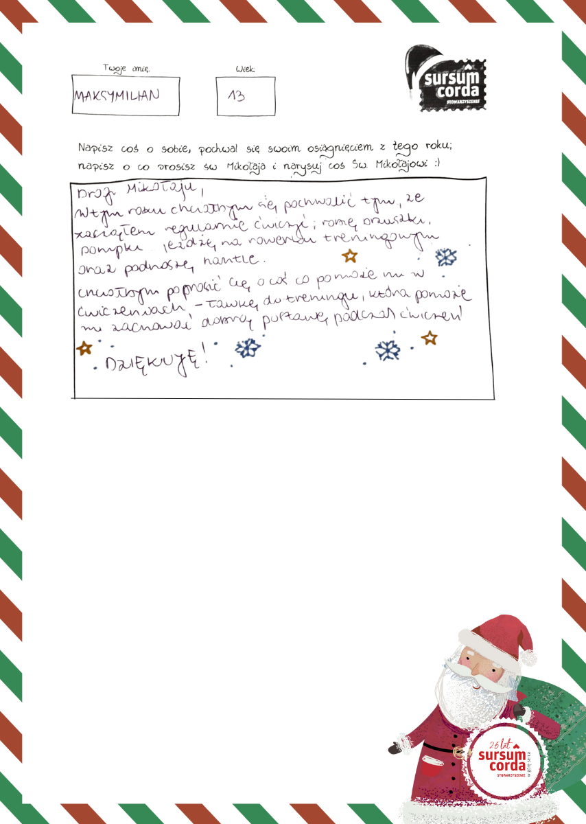 Maksymilian urodził się bez kciuka i kości promieniowej w prawej ręce. Przeszedł kilka operacji i planowane są następne. Jego zainteresowania to historia, sport, geografia oraz gry komputerowe. Jest bardzo miłym i przyjaznym nastolatkiem.