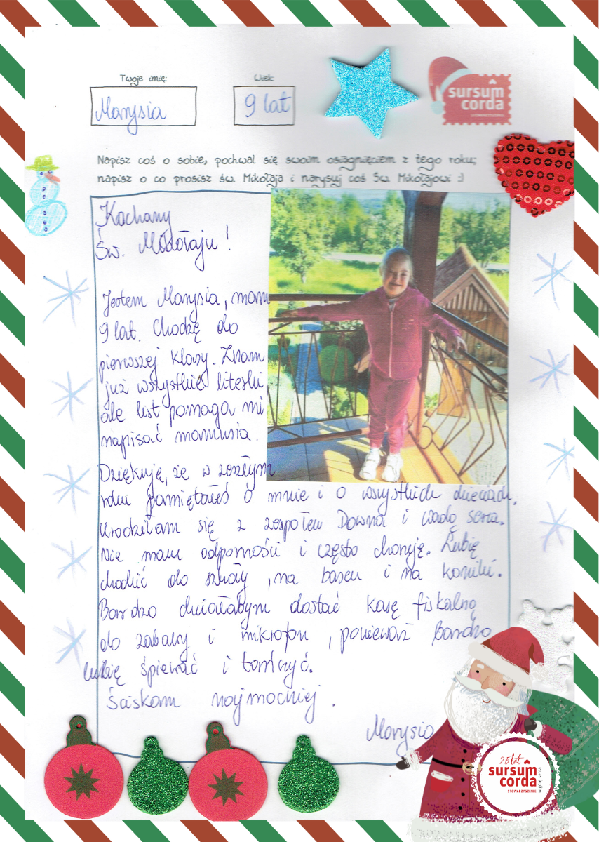 Marysia urodziła się zespołem Downa i wrodzona wadą serca. Jest wesołą 9 latką, mało mówi, ma obustronny niedosłuch. Od września poszła do szkoły specjalnej. Lubi śpiewać, tańczyć, pływać na basenie. i jęźdźić konno. Jest bardzo pomocna i opiekuńcza. szczególnie w stosunku do młodszego brata. Marysia jest pod opieką poradni kardiologicznej, immunologicznej, audiologicznej, laryngologicznej, otropedycznej, dermatologicznej i pulmunologicznej.