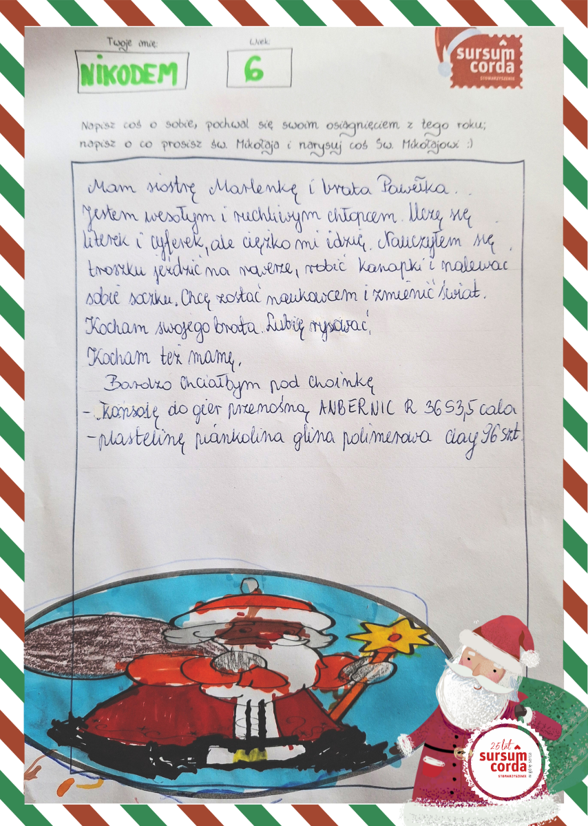 Nikodem jest wesołym i ruchliwym dzieckiem. Często bawi się ze starszą siostrą Marlenką. Chodzi do zerówki. Dopiero uczy się literek i cyferek co idzie mu z trudnościami, ale jest mądrym chłopcem. Lubi słuchać i oglądać bajki o wilkach. Interesuje się grami minecraft. Chodzi na karate. W tym roku nauczył się jedzić na rowerku.