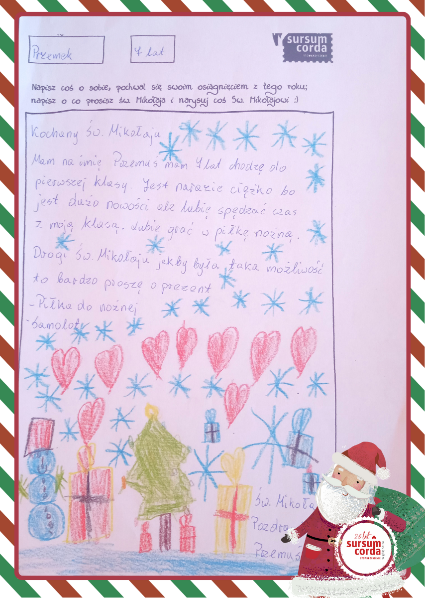 Przemuś ma 7 lat i chodzi do pierwszej klasy szkoły podstawowej. To wesoły, towarzyski chłopiec, który lubi spędzać czas z kolegami, koleżankami oraz swoim rodzeństwem. W wolnych chwilach najchętniej bawi się na świeżym powietrzu – uwielbia jeździć na rowerze, puszczać samoloty i grać w piłkę.