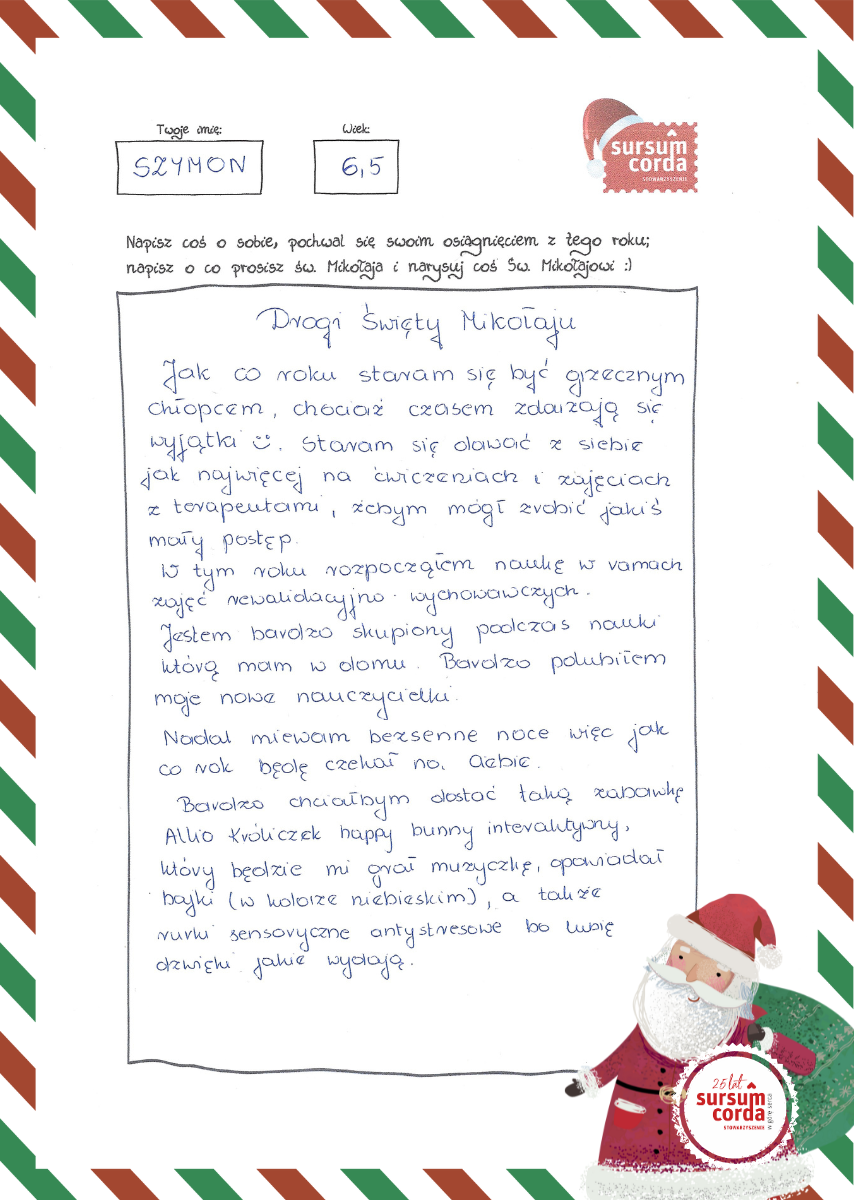 Szymon to skrajny wcześniak. Zmaga się z MPD (postać mieszana: piramidowo – pozapiramidowa z elementami zaburzeń móżdżkowych),wiotkie porażenie czterokończynowe, retinopatia wcześniacza duża wada wzroku . Szymonek jest bardzo wesołym chłopcem, lubiącym się śmiać, podskakiwać na rękach osób go trzymających. Czasem ma tez swoje humorki. Bardzo lubi muzyk, która towarzyszy mu wszędzie i umila czas, jak również spacery. W związku z dużym opóźnieniem rozwojowym codziennie zmagamy się z dojazdami na rehabilitację, wizytami u specjalistów i zajęcia terapeutyczne, żeby mógł sam usiąść i utrzymać stabilnie prosto głowę. Dla nas to największe MARZENIE.