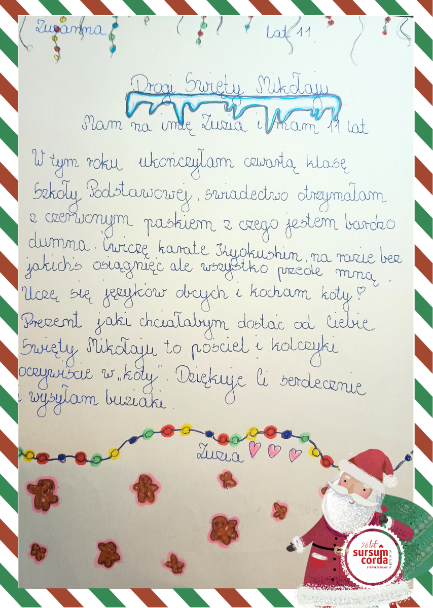 Zuzia jest mądrą i ciekawą świata dziewczynką. Bardzo często obserwuje zwierzęta. Najbardziej kocha koty, taka kocia mama. Ćwiczy karate które daje Jej odskocznię od nauki. Jest pogodna i często się uśmiecha.